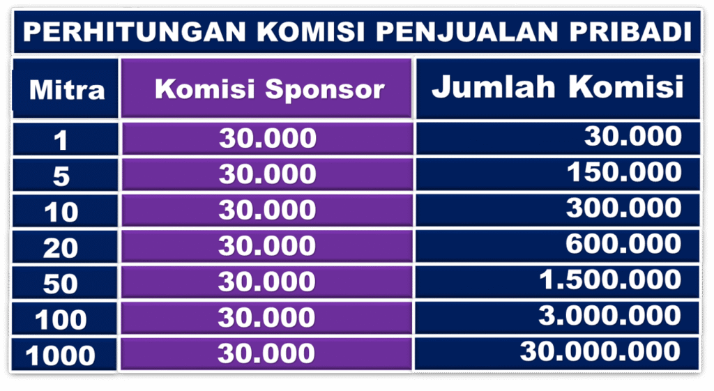 Berikut tabel simulasi perhitungan komisi sponsor/komisi penjualan langsung yang anda terima sesuai jumlah penjualan anda :