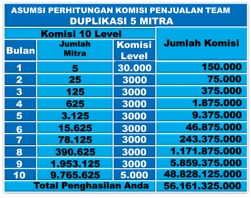Berikut tabel perhitungan potensi penghasilan anda dengan asumsi duplikasi 5 team